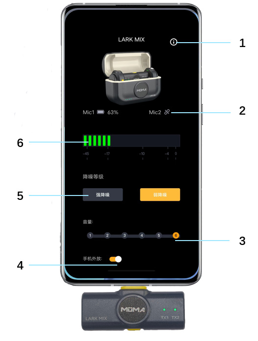 答:APP上可以查看麦克风实时电量、录音电平波动以及版本信息等参数,除此之外,还可以设置麦克风输出音量大小,设置强弱降噪以及外放功能等等;